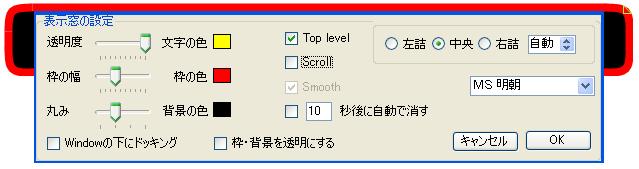 | 透明度 | スライダー | 表示窓全体の文字を含めての透明度を設定できます。右端で100%、左端で10%の不透明度となります。 |