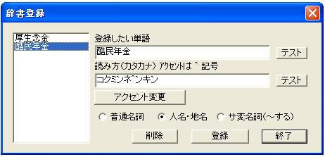 | アクセント変更ボタン | アクセント変更ボタンを押すと、順次アクセント変更が行われ発音されますので、最適なものを選択します。 |